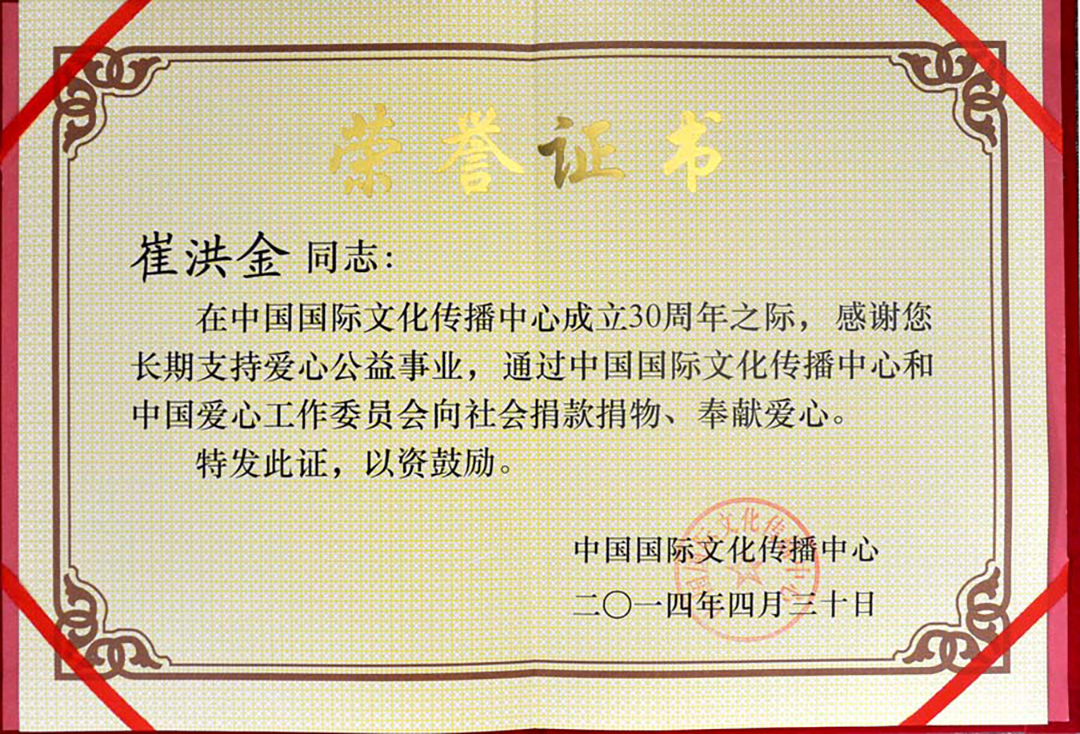 2014年 崔洪金董事長(cháng)獲中國國際文化傳播中心30周年榮譽(yù)證書(shū)