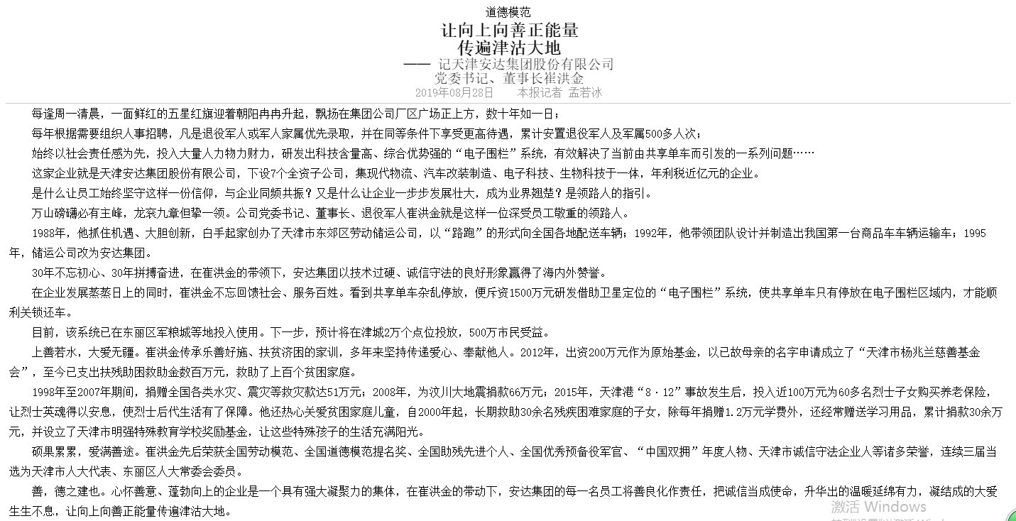 > 《天津日報》刊發(fā) 讓向上向善正能量傳遍津沽大地-記天津安達集團股份有限公司黨委書(shū)記董事長(cháng)崔洪金